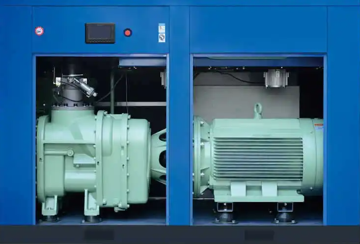 螺桿式制冷壓縮機的基本結構,主要由轉子、機殼、軸承、軸封、平衡活塞及能量調節裝置組成。兩個按一定傳動比反向旋轉又相互嚙合的轉子平行地配置在呈“&”字形的氣缸中。吸氣端座和氣缸上部設有軸向和徑向吸氣孔口,排氣端座和滑閥上分別設有軸向和徑向排氣孔口。壓縮機的吸、排氣孔口是按其工作過程的需要精心設計的,可以根據需要準確地使工作容積和吸、排氣腔連通或隔斷。
